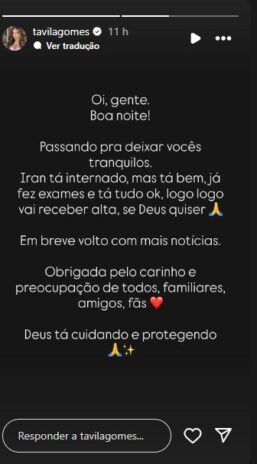 De acordo com Távila, Luva teria realizado exames e está bem. “Oi, gente. Boa noite! Passando pra deixar vocês tranquilos. Iran tá internado, mas está bem, já fez exames e tá tudo ok. Logo logo vai receber alta, se Deus quiser. Em breve, volto com mais notícias. Obrigada pelo carinho e preocupação de todos, familiares, amigos e fãs. Deus tá cuidando e protegendo”, disse a namorada do influenciador.