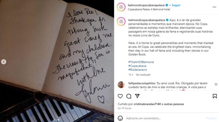 Através das redes sociais do hotel Copacabana Palace, a mensagem deixada por Madonna dizia: “Eu te amo, Rio! Obrigada por cuidarem tão bem de mim e dos meus filhos. A vista do mar é magnífica! Com amor, Madonna“, escreveu a cantora no Livro de Ouro.