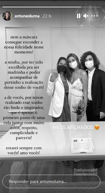 “Nem a máscara consegue esconder a nossa felicidade nesse momento! A minha, por ter sido escolhida pra ser madrinha e poder acompanhar de pertinho a realização desse sonho de vocês!”, iniciou.