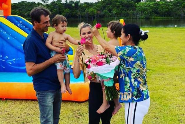 Nos registros, Andressa aparece feliz ganhando flores dos seus herdeiros, Gabriel e Samuel, ambos do seu casamento com o cantor sertanejo Gusttavo Lima.
