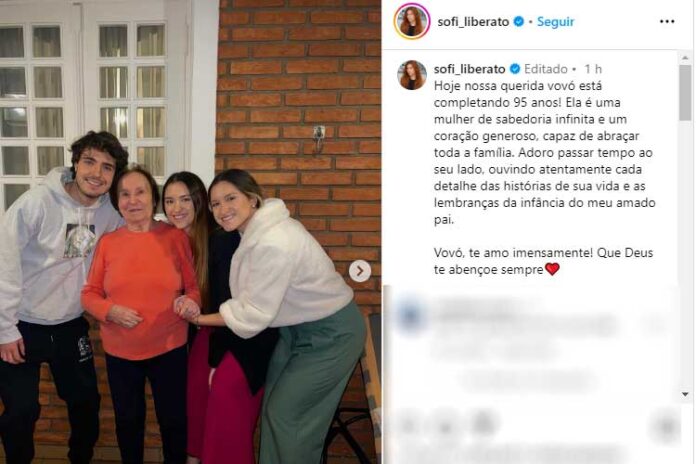 “Hoje nossa querida vovó está completando 95 anos! Ela é uma mulher de sabedoria infinita e um coração generoso, capaz de abraçar toda a família. Adoro passar tempo ao seu lado, ouvindo atentamente cada detalhe das histórias de sua vida e as lembranças da infância do meu amado pai. Vovó, te amo imensamente! Que Deus te abençoe sempre”, escreveu.