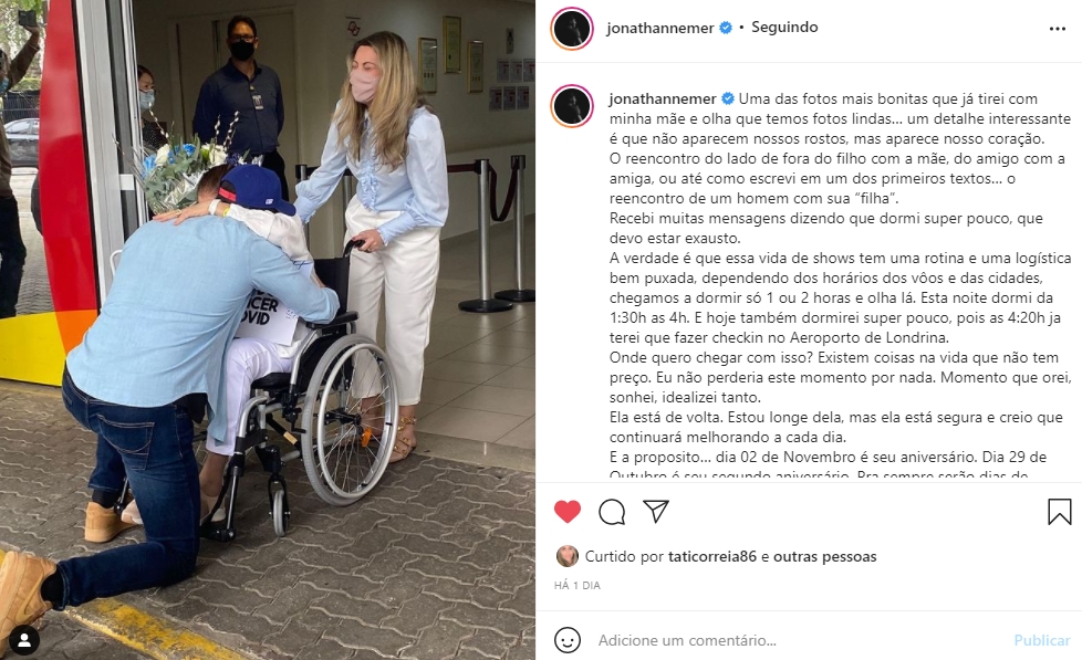 Dessa forma, na tarde desta sexta-feira, 29 de outubro, Jonathan Nemer compartilhou um longo texto, onde desabafou sobre o medo de perder a mãe e a vitória dela receber alta. “Uma das fotos mais bonitas que já tirei com minha mãe e olha que temos fotos lindas… um detalhe interessante é que não aparecem nossos rostos, mas aparece nosso coração”, iniciou.