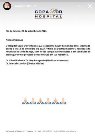 ‘‘O Hospital Copa D’Or informa que o paciente Kayky Fernandes Brito, internado desde o dia 2 de setembro de 2023, vítima de politraumatismos, recebeu alta hospitalar na tarde de hoje, com lesões corrigidas com sucesso e em condições de prosseguir com o processo de reabilitação em sua residência’’, dizia a nota.