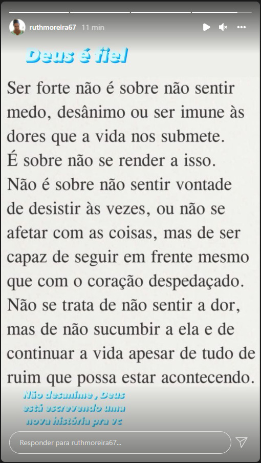 Sendo assim, ela prosseguiu: “Não é sobre não sentir vontade de desistir às vezes, ou não se afetar com as coisas, mas de ser capaz de seguir em frente mesmo com o coração despedaçado. Não se trata de não sentir a dor, mas de não sucumbir a ela e de continuar a vida, apesar de tudo de ruim que possa estar acontecendo”. Na publicação, Ruth ainda escreveu: “Não desanime, Deus está escrevendo uma nova história para você”, disse ela.