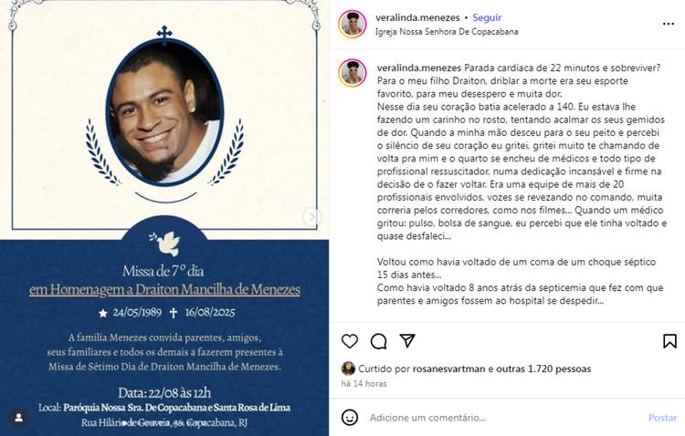 Em seu perfil oficial no Instagram, Veralinda publicou uma nota da missa de sétimo dia do filho e uma sequência de registros do herdeiro com a família. “Parada cardíaca de 22 minutos e sobreviver? Para o meu filho Draiton, driblar a morte era seu esporte favorito, para meu desespero e muita dor. Nesse dia seu coração batia acelerado a 140. Eu estava lhe fazendo um carinho no rosto, tentando acalmar os seus gemidos de dor”, começou ela na legenda do post.