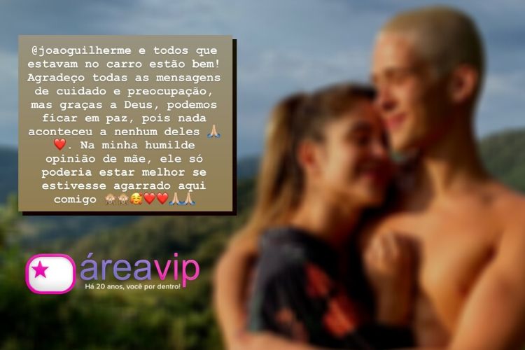 “O João Guilherme e todos que estavam no carro estão bem! Agradeço todas as mensagens de cuidado e preocupação, mas graças a Deus, podemos ficar em paz pois nada aconteceu a nenhum deles”, disse ela que, mamãe coruja que só, brincou com a situação do filho estar com o pai: “Na minha humilde opinião de mãe, ele só poderia estar melhor se estivesse agarrado aqui comigo”, disse ela. Veja na imagem abaixo separada pela equipe de arte do Área VIP: