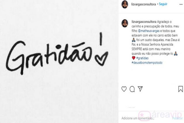 Agradecida, ela trouxe uma fotografia com estampada com a palavra “gratidão”, e na legenda, deu detalhes. “Agradeço o carinho e preocupação de todos, meu e todos que estavam com ele no carro estão bem. Foi um susto daqueles”, disse. “Deus é Pai, e a Nossa Senhora Aparecida SEMPRE está com meu menino quando eu não posso protege-lo”, concluiu a empresária, que ainda acrescentou as hashtags: “gratidão” e “Deus é bom o tempo todo”.