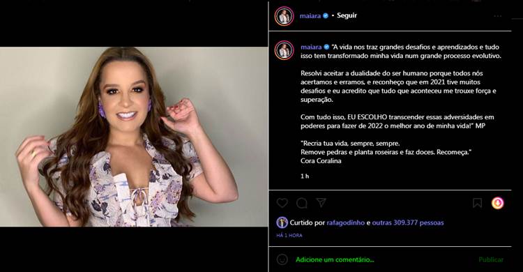 A irmã de Maraísa falou de planos. “Resolvi aceitar a dualidade do ser humano porque todos nós acertamos e erramos, e reconheço que em 2021 tive muitos desafios e eu acredito que tudo que aconteceu me trouxe força e superação. Com tudo isso, eu escolho transcender essas adversidades em poderes para fazer de 2022 o melhor ano de minha vida!”, declarou ela.