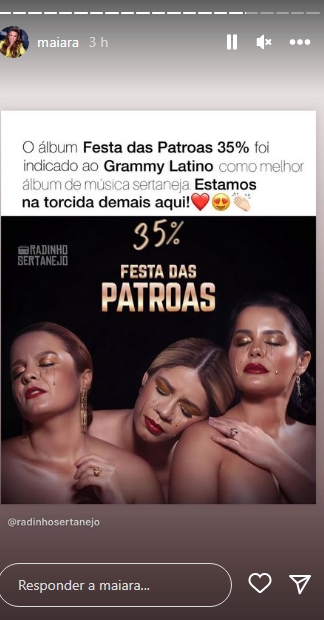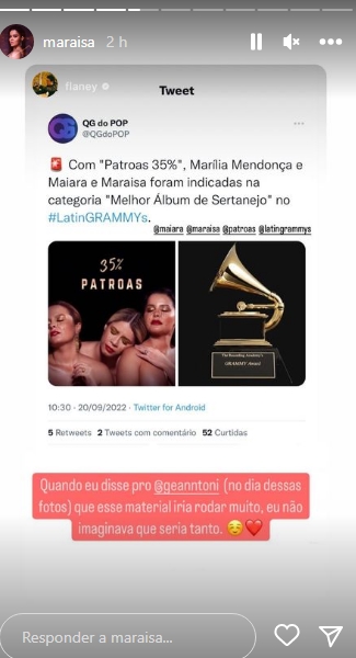 Quem também não deixou a notícia passar em branco e celebrou muito o feito, foi sua irmã Maraisa que comemorou ao saber que o trabalho delas chegou longe. Em suas redes sociais nos Stories, Maraisa falou sobre o momento especial.