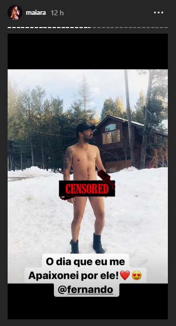 Maiara postou em seus stories, uma imagem em que Fernando aparece sem roupa, em meio à neve. Ela ainda usou uma tarja para não mostrar demais.