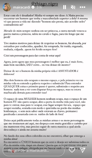 Maíra se mostrou completamente aberta ao novo amor. “O espaço de uma mulher, homem nenhum ocupa, mas o espaço de um homem eu não quero ocupar. Abro a porta da minha vida para você, não para entrar, mas para ocupar esse lugar que sempre foi seu. Espaço que ocupei sozinha, sentada com medo e quietinha no porão das minhas lembranças, e sem nem saber onde estavam as chaves. Permaneci paralisada e assustada com os ruídos do lado de fora”, escreveu.