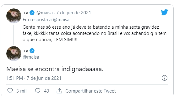 “Gente, mas só esse ano já deve ta batendo a minha sexta gravidez fake. Tanta coisa acontecendo no Brasil e vocês achando que não tem o que noticiar, TEM SIM!!!!”, esbravejou.