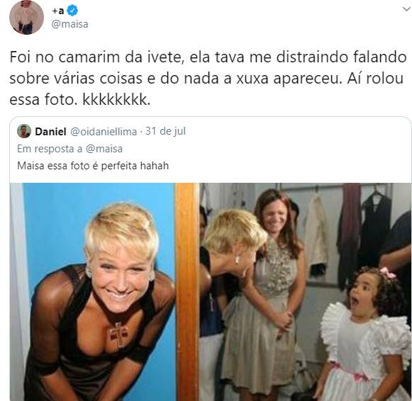 Na última sexta-feira (31), um fã achou uma foto em que Maisa aparece de boca aberta ao encontrar com Xuxa. “Maisa, essa foto é perfeita”, escreveu o internauta. A famosa logo viu a publicação e comentou sobre o momento. “Foi no camarim da ivete, ela tava me distraindo falando sobre várias coisas e do nada a xuxa apareceu. Aí rolou essa foto. kkkkkkkk.”