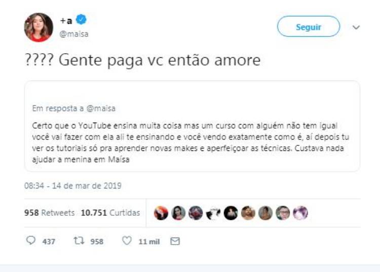 Tudo começou quando uma internauta pediu para Maisa pagar um curso de maquiagem. “Ai, Maisa, paga um curso de automake pra mim, por favor. Eu não sei nem passar base na cara. Mulher, meu Deus, ajuda uma menina pobre que precisa ir maquiada pro trabalho todo dia e vai só de batom”, pediu ela.