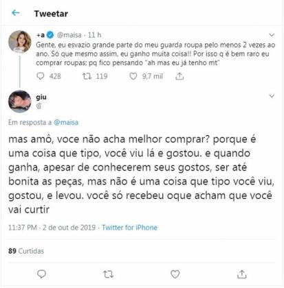 Então, Maisa contestou o “tweet” da seguidora, dizendo que tem uma stylist que monta os looks para ela e se gostar muito de uma peça, ela compra.