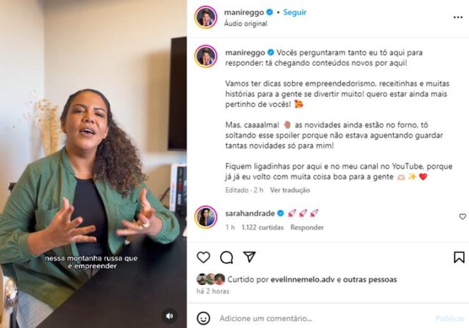 Na sequência, Mani revelou o que de fato vai mostrar para seus seguidores, os ex-calabresos: “Vamos ter dicas sobre empreendedorismo, receitinhas e muitas histórias para a gente se divertir muito! quero estar ainda mais pertinho de vocês!“, disse. “Mas, caaaalma! As novidades ainda estão no forno, tô soltando esse spoiler porque não estava aguentando guardar tantas novidades só para mim!“, completou.