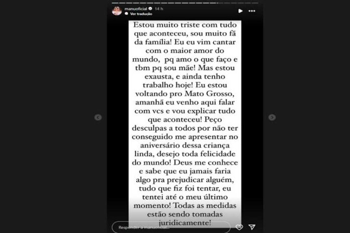 Em conversa com o Portal Leo Dias, Manu explicou que um funcionário recém-contratado contratou um jato pago pela influenciadora para levá-la até o evento, no entanto, a aeronave não apareceu e a artista ficou esperando no aeroporto, resultando em seu atraso.