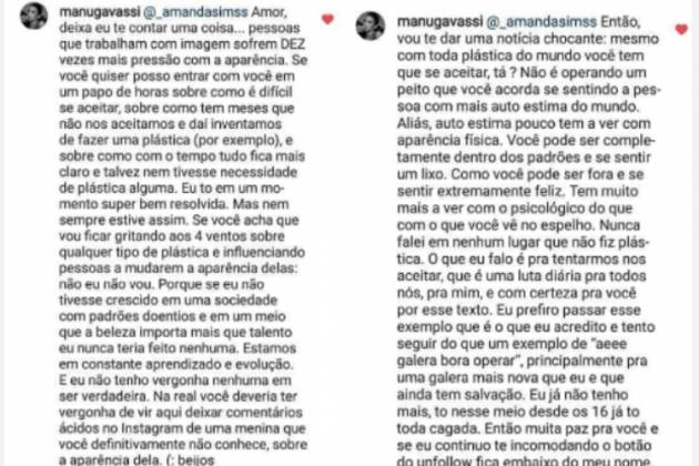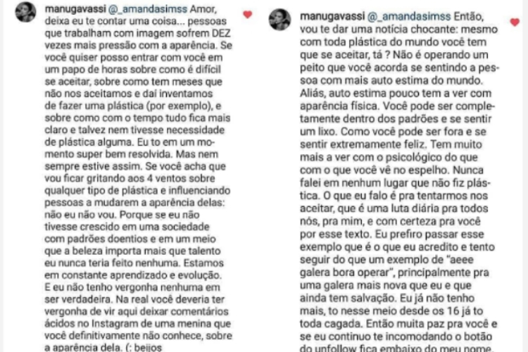 Em um dos comentários da publicação, uma seguidora questionou Manu Gavassi sobre procedimentos estéticos. Em resposta a cantora, que fez rinoplastia e colocou silicone nos seios, falou sobre autoestima, aceitação e pontua que foi vítima de uma sociedade de padrões:”Se eu não tivesse crescido numa sociedade com padrões doentios e em um meio que a beleza importa mais que talento, eu nunca teria feito nenhuma plástica“. Ela ainda comentou que pessoas de sua área sofrem 10 vezes mais pressão estética, mas que hoje, já não se importa com isso.