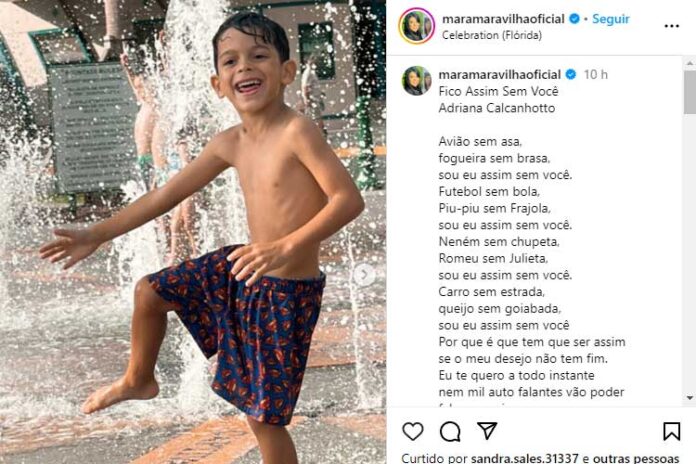As imagens mostram o garoto se divertindo durante a viagem pela Flórida, nos Estados Unidos. Na legenda, Mara usou a letra da música “Fico Assim Sem Você”, de Adriana Calcanhoto, para se declarar ao herdeiro.