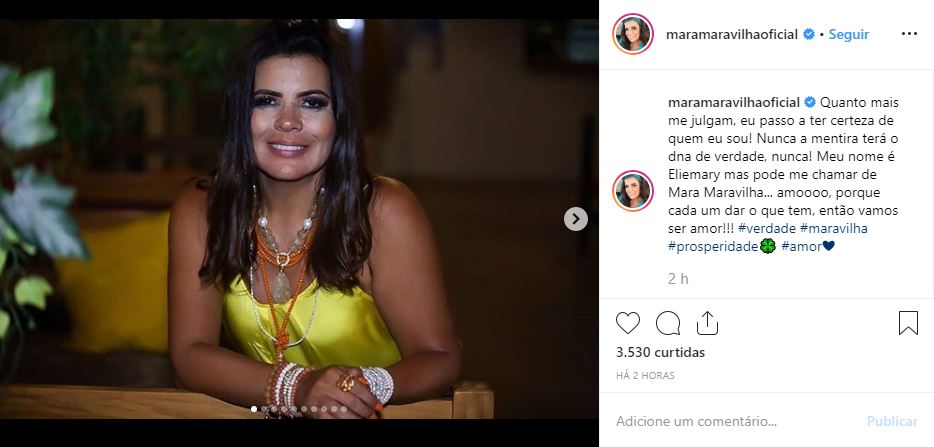 “Quanto mais me julgam, eu passo a ter certeza de quem eu sou! Nunca a mentira terá o DNA de verdade, nunca! Meu nome é Eliemary mas pode me chamar de Mara Maravilha. Amo, porque cada um dá o que tem, então vamos ser amor!”, escreveu ela na legenda do post.