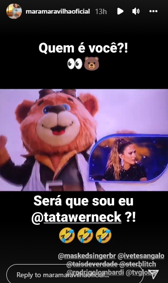 “Quem é você”, questionou Mara nos stories. “Será se sou eu Tatá Werneck?”, questionou a morena. No entanto, pelas redes sociais, internautas foram a loucura com a fala da humorista e levaram no bom humor a possível participação da apresentadora do SBT no ‘The Masked SInger Brasil’.