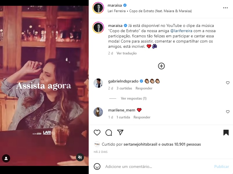 “Já está disponível no YouTube o clipe da música Copo de Extrato da nossa amiga @lariferreira com a nossa participação, ficamos tão felizes em participar e cantar essa moda! Corre para assistir, comentar e compartilhar com os amigos, está incrível”, disparou Maraisa em sua postagem, demonstrando que está mais do que feliz com esse mega resultado.