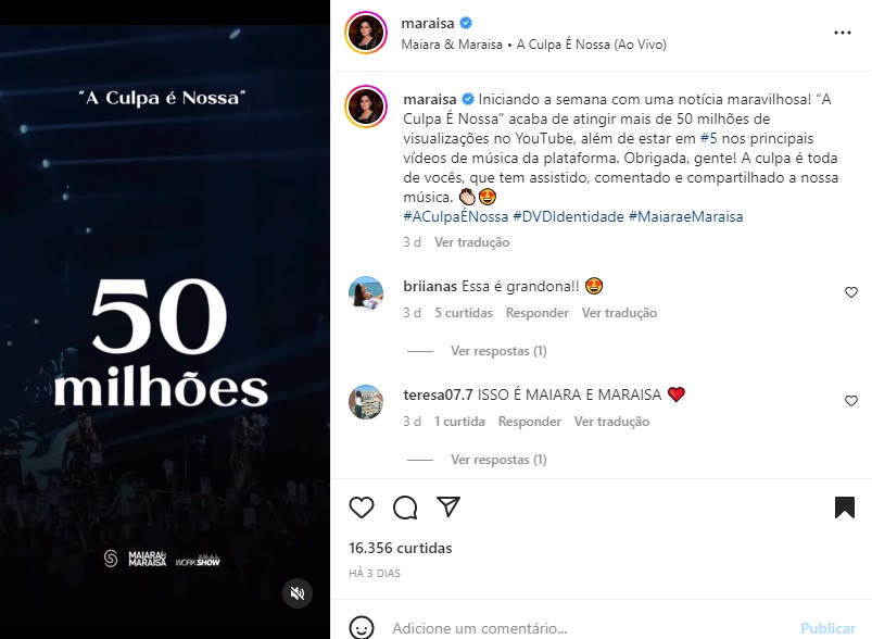 “Iniciando a semana com uma notícia maravilhosa! “A Culpa É Nossa” acaba de atingir mais de 50 milhões de visualizações no YouTube, além de estar em #5 nos principais vídeos de música da plataforma. Obrigada, gente! A culpa é toda de vocês, que tem assistido, comentado e compartilhado a nossa música”, destacou Maraisa.