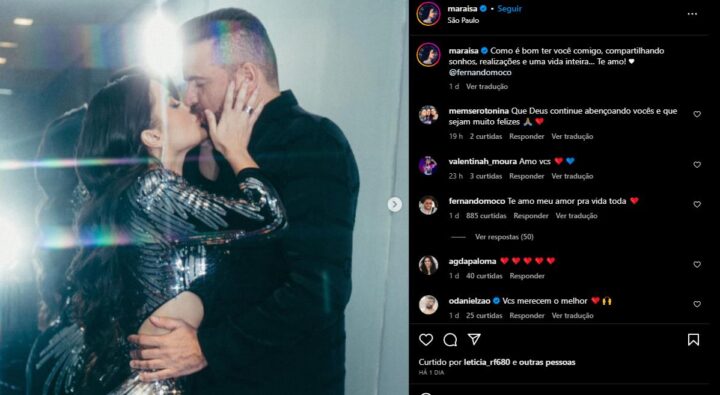 Recentemente, como você deve ter acompanhado aqui no Área VIP, a cantora e compositora Maraisa, da dupla sertaneja com Maiara, assumiu o namoro com o empresário Fernando Mocó. Vale lembrar que os pombinhos estão noivos e prestes a casar.