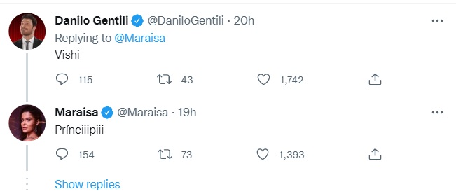 Então, Danilo também se manifestou sobre o affair com a cantora sertaneja: ”Desde a primeira vez que eu entrevistei elas [no programa ‘The Noite’, do SBT], em 2016, elas foram no meu programa, as três, Maiara, Maraisa e a Marília [Mendonça]. Ali eu já vi que elas eram especiais… a Maraisa é demais”, declarou.