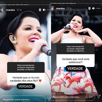 Interagindo com seguidores, Maraisa ainda falou sobre outros assuntos de sua vida, como por exemplo ter filhos, ela afirmou que não pretende ter filhos tão cedo: “É verdade que pretende ter filhos nos próximos três anos?”, perguntou um seguidor. “Mentira”, respondeu Maiara. “Verdade que você está solteirona?”, escreveu outro fã. “Verdade”, escreveu a cantora sertaneja, na caixinha de mensagens.