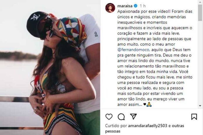 Em um vídeo em que ambos aparecem felizes, aproveitando o momento juntos, ela destaca o quanto se sente realizada e segura. “Apaixonada por esse vídeo!! Foram dias únicos e mágicos, criando memórias inesquecíveis e momentos maravilhosos e incríveis que aquecem o coração e fazem a vida mais leve, principalmente ao lado de pessoas que amo muito, como o meu amor @fernandomoco. Aquilo que Deus tem para a gente, ninguém tira”, iniciou.