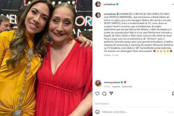 “Patrícia Abravanel, que emocionou o Brasil inteiro ao entrar no palco para a homenagem linda e alto astral a seu pai, Silvio Santos, único e insubstituível na TV, como disse ao Luciano Huck! E mostrou que é herdeira,sim, do maior patrimônio que seu pai deixou lhe deixou: o dom da alegria e o poder da comunicação!”, iniciou Sonia abrão à Patrícia.