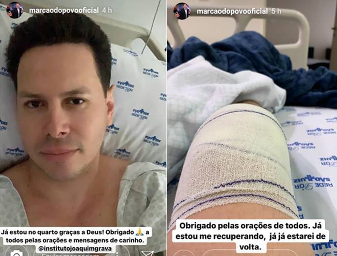 Após passar pela cirurgia que foi feita no joelho, o apresentador usou as redes sociais para tranquilizar seu seguidores, em seu Instagram nos stories, ele postou duas fotos, uma em que aparece parte de seu joelho enfaixado, e outra em que ele já no quarto disse estar bem e agradece as orações. ( veja fotos abaixo)