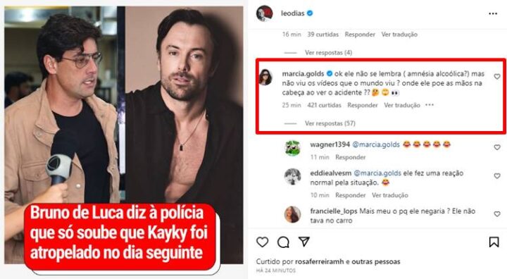 No entanto, as falas do artista global chocaram a todos, e Márcia Goldschmidt reagiu: “Ok ele não se lembra (amnésia alcoólica?) mas não viu os vídeos que o mundo viu? Onde ele põe as mãos na cabeça ao ver o acidente??“, disse ela, ainda usando emojis sugestivos em uma publicação feita por Léo Dias sobre o caso. Outros internautas, até agora, não entenderam também o que teria acontecido com Bruno e seu depoimento.