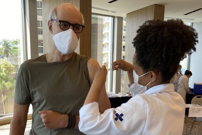 Com um clique ao lado da profissional da saúde, Caruso revelou que mesmo devidamente vacinado segue com todos os protocolos de segurança contra a doença.