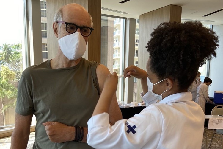 Feliz da vida e consciente, o ator contou que tomou a dose do reforço da vacina contra covid-19.