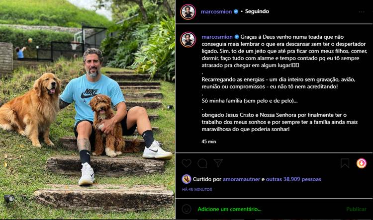 Em seu perfil no Instagram, ele publicou um registro ao lado dos cachorros. “Graças à Deus venho numa toada que não conseguia mais lembrar o que era descansar sem ter o despertador ligado. Sim, to de um jeito que até pra ficar com meus filhos, comer, dormir, faço tudo com alarme e tempo contado porque eu tô sempre atrasado pra chegar em algum lugar!”, lembrou o apresentador.