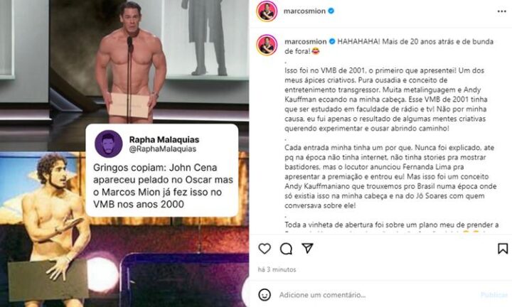 O apresentador Marcos Mion virou um dos nomes mais repercutidos da internet no Brasil ao escancarar em suas redes sociais, na manhã desta segunda-feira, 11 de março, que o ator norte-americano John Cena plagiou a sua ideia, feita em 2001 no VMB, após o mesmo surgir ‘pelado’ no Oscar 2024.