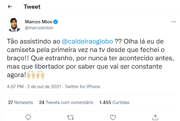 “Tão assistindo ao Caldeirão? Olha lá eu de camiseta pela primeira vez na TV desde que fechei o braço! Que estranho, por nunca ter acontecido antes, mas que libertador por saber que vai ser constante agora!”, escreveu ele