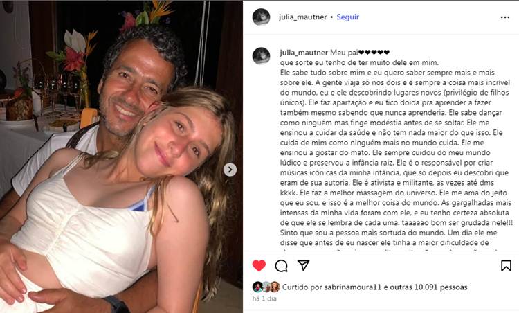 Julia continuou enumerando as qualidades do pai. “Ele sabe dançar como ninguém mas finge modéstia antes de se soltar. Ele me ensinou a cuidar da saúde e não tem nada maior do que isso. Ele cuida de mim como ninguém mais no mundo cuida. Ele me ensinou a gostar do mato. Ele sempre cuidou do meu mundo lúdico e preservou a infância raiz. Ele é o responsável por criar músicas icônicas da minha infância, que só depois eu descobri que eram de sua autoria. Ele é ativista e militante, as vezes até dms kkkk. Ele faz a melhor massagem do universo. Ele me ama do jeito que eu sou, e isso é a melhor coisa do mundo. As gargalhadas mais intensas da minha vida foram com ele, e eu tenho certeza absoluta de que ele se lembra de cada uma. taaaaao bom ser grudada nele!!! Sinto que sou a pessoa mais sortuda do mundo”, completou.