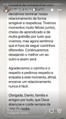 Direta e reta, Margareth Serrão explicou nos stories do Instagram: “Gostaria de compartilhar com vocês que eu e o Danilo decidimos terminar nosso relacionamento de forma amigável e respeitosa. Tivemos momentos muito felizes juntos, cheios de aprendizado e de muita gratidão por tudo que vivemos, mas agora sentimos que é hora de seguir caminhos diferentes”, começou ela.