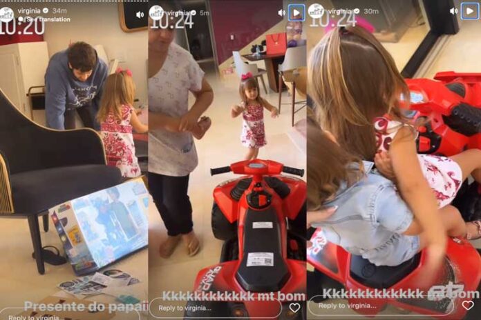O cantor comprou um quadriciclo vermelho avaliado entre R$ 2500 e R$ 3000 para a herdeira e compartilhou alguns detalhes com seus seguidores nos Stories do Instagram. “Presente do papai. Kkk, muito bom”, disse Zé, mostrando Maria Alice usando o brinquedo.