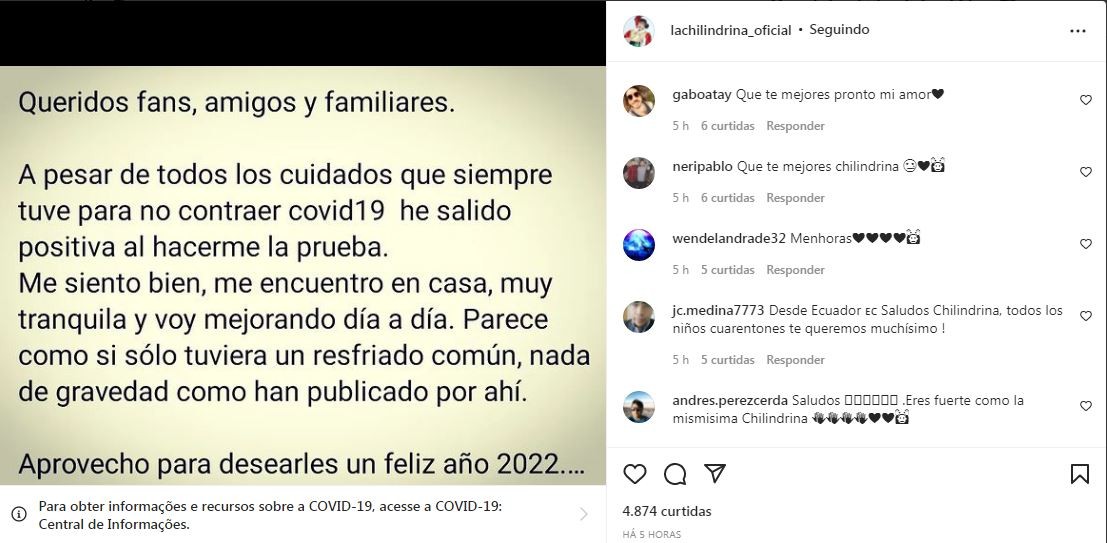 “Queridos fãs, amigos e familiares: Apesar de todos os cuidados que sempre tive para não contrair Covid-19, testei positivo ao fazer o exame. Me sinto bem, estou em casa, estou muito tranquila e melhorando a cada dia. Parece que só tive um resfriado comum, nada de grave como andam publicando por aí. Aproveito para desejar a todos um feliz 2022”, disse a atriz.