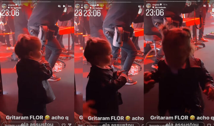 Virginia não perdeu a oportunidade de compartilhar o momento e a sua reação. Na legenda do Stories, ela publicou uma afirmando que a filha havia se assustado. Usando emojis de risos, a influenciadora se divertiu. “Gritaram FLOR. Acho que ela se assustou”, escreveu, mostrando a herdeira dando meia volta ao ouvir o grito.