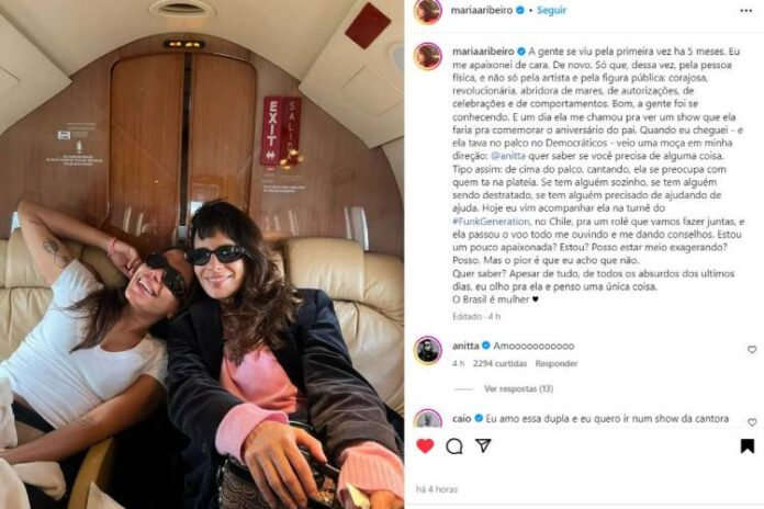 Maria, que compartilhou algumas fotos no jatinho particular da cantora enquanto elas voavam para Santiago, no Chile, relatou a atitude que a artista teve com ela durante essa viagem: “Se tem alguém sozinho, se tem alguém sendo destratado, se tem alguém precisado de ajudando de ajuda. Hoje eu vim acompanhar ela na turnê do ‘Funk Generation’, no Chile, para um rolê que vamos fazer juntas, e ela passou o voo todo me ouvindo e me dando conselhos”.