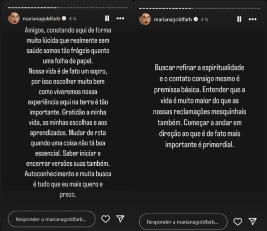 “Amigos, constando aqui forma muito lúcida que realmente sem saúde somos tão frágeis quanto uma folha de papel. Nossa vida é de fato um sopro, por isso, escolher muito bem como viveremos nossa experiência aqui na Terra é tão importante”, iniciou Mariana nos stories do Instagram.