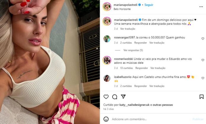 Através do feed no Instagram, Mariana Polastreli compartilhou um clique deitada e na legenda da postagem anunciou aos seguidores: “Fim de um domingo delicioso por aqui. Uma semana maravilhosa e abençoada para todos nós“, desejou ela.