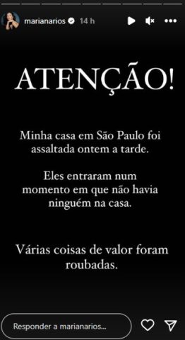 No entanto, a atriz ainda informou que a polícia já está com as imagens do assalto e trabalha à todo vapor para solucionar o caso. Ainda por meio dos stories no Instagram, Mariana pediu ajuda de seus seguidores. “Peço a todos que trabalham com sites e vendas de artigos de luxo que me ajudem com alguma informação, se por acaso tiverem acesso a peças específicas e exclusivas das marcas: Chanel, Louis Vuitton, Fendi, Prada“, clamou ela.