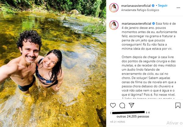 “Essa foto é de 4 de janeiro desse ano, poucos momentos antes de eu, euforicamente feliz, escorregar na grama e fraturar a perna de um jeito que poucos conseguiriam! Rs Eu não fazia a mínima ideia do que estava por vir. Ontem depois de chegar à casa livre dos pontos da segunda cirurgia e das muletas, e de receber do meu médico um áudio lindo falando de encerramento de ciclo, eu caí no choro. De soluçar! Sabem aquelas cenas de filme ou de novela em que a pessoa chora debaixo do chuveiro e você não sabe nem o que é água e o que é lágrima? Pois é. Foi nesse nível. A linha do tempo passou na mente e eu desaguei”, contou ela.