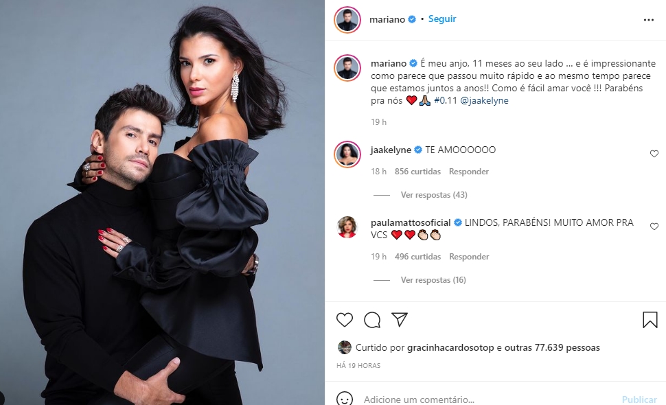 Na publicação os dois surgem coladinhos, e produzidos para a data especial: “É meu anjo, 11 meses ao seu lado. E é impressionante como parece que passou muito rápido e ao mesmo tempo parece que estamos juntos há anos! Como é fácil amar você! Parabéns pra nós”, escreveu o sertanejo na legenda.
